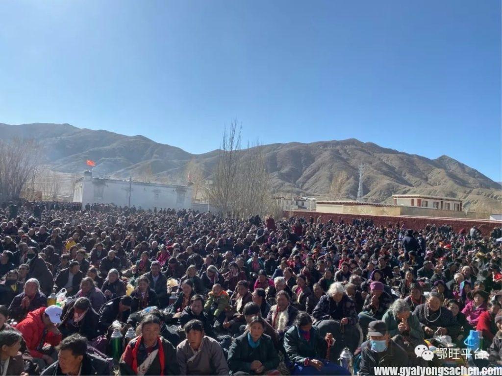 དུས་བཟང་འདིར་གནས་དེ་གར་དད་ལྡན་མང་ཚོགས་ཁྲི་ཕྲག་ལྷག་ཙམ་དང་དགེ་འདུན་བརྒྱ་ཕྲག་གཅིག་ལྷག་ཙམ་བཅས་འདུས་ནས་སྙིགས་དུས་འགྲོ་བའི་མགོན་པོ་འཇམ་དབྱངས་མི་ཡི་རོལ་གར་དཔལ་ངོར་དགོན་ཨེ་ཝཾ་ཆོས་ལྡན་གྱི་