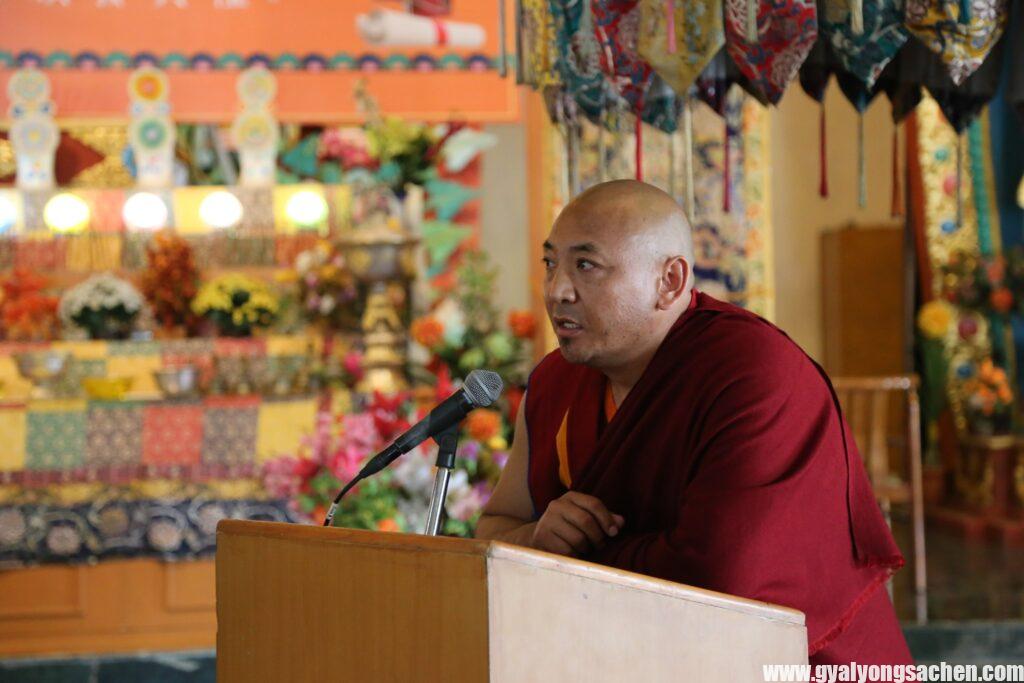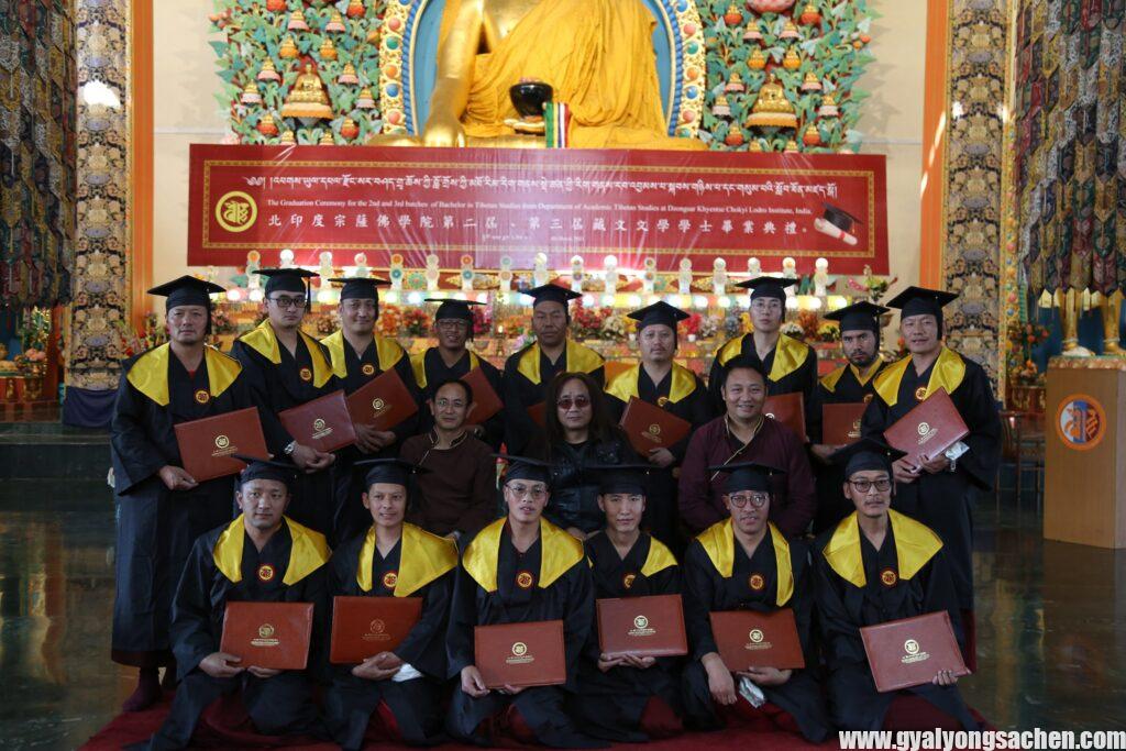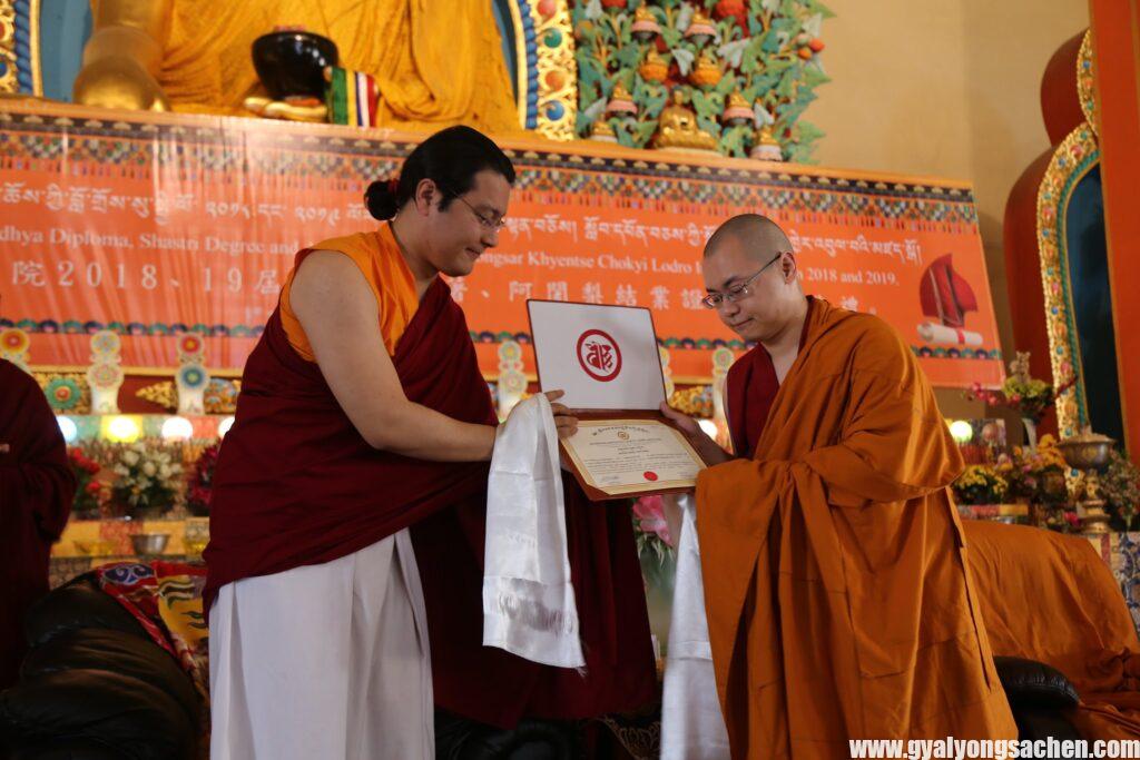 ཉིན་རྒྱབ་ཆུ་ཚོད་གཉིས་པར་༸སྐྱབས་རྗེ་གདུང་སྲས་རྣམ་པ་གཉིས་ཀྱིས་དབུས་པའི་མཁན་དགེ་འདུས་པ་ཡོངས་གཙུག་ལག་ཁང་དུ་འཛོམས་ཏེ་མཐོ་རིམ་རིག་གནས་སྐབས་གཉིས་པ་དང་གསུམ་པའི་སློབ་མ་རྣམས་ལ་བསླབ་པ་མཐར་སོན་གྱི་ཕྱག་འཁྱེར་འབུལ་བའི་མཛད་སྒོ་ཚོགས། མཛད་སྒོའི་ཐོག་མར་ཡིག་རྒྱུགས་ཚོགས་ཆུང་གི་ཡིག་རྒྱུགས་དོ་དམ་པ་མཁན་པོ་སྒྲོལ་མ་དར་རྒྱས་མཆོག་ནས་འདུས་མང་ཡོངས་ལ་འཚམས་འདྲི་ཞུས་པ་དང་། ༸སྐྱབས་རྗེ་འཁོན་གདུང་ཨ་བྀ་ཀྲི་ཏ་བཛྲ་རིན་པོ་ཆེ་མཆོག་གིས་མཐར་ཕྱིན་སློབ་མ་རྣམས་ལ་རིག་གནས་རབ་འབྱམས་པའི་ཕྱག་འཁྱེར་བསྩལ། དེ་ནས་བཤད་གྲྭའི་ལས་ཐོག་མཁན་རིན་པོ་ཆེས་མཛད་སྒོའི་ཚོགས་ཐེངས་གཉིས་པར་ཕེབས་མཁན་རྣམ་པར་འཚམས་འདྲི་དང་བཅས་གསུང་བཤད་གནང་དོན། རྩ་བའི་ཆ་ནས་མཁན་སྤྲུལ་རྣམ་གཉིས་ཀྱི་ཐུགས་ཀྱི་གཅེས་ནོར་དུ་གྱུར་པའི་བཤད་གྲྭ་འདིའི་ནང་གཞི་རིམ་དང་། མཐོ་རིམ་རིག་གནས། གཞུང་ཆེན་སློབ་གཉེར་ཏེ་སྡེ་ཚན་གསུམ་ཡོད་པའི་ངོ་སྤྲོད་དང་། འཛམ་གླིང་གོ་ལ་འདིའི་ནང་ཕྱིའི་དཔལ་འབྱོར་ཡར་རྒྱས་ཞེ་དྲག་སོང་ཡོད་ན་ཡང་ནང་གི་བསམ་བློ་གཏོང་ཕྱོགས་ལ་ཕྲག་དོག་འགྲན་སེམས་སོགས་རབ་ཏུ་འཕེལ་གྱི་ཡོད་པ་དེ་དག་ཞི་བྱེད་དམ་པའི་ཆོས་སློབ་གཉེར་དང་ཉམས་ལེན་བྱེད་པ་ལ་རག་ལས་ཤིང་། དམ་པའི་ཆོས་སློབ་གཉེར་བྱེད་པར་རྒྱ་དབྱིན་སོགས་སྐད་ཡིག་གཞན་གྱི་སྟེང་ནས་བྱེད་རྒྱུ་ཡོད་ན་ཡང་མདོ་སྔགས་ཆ་ཚང་བ་བཞུགས་པའི་བོད་བརྒྱུད་ནང་བསྟན་ལ་སློབ་གཉེར་བྱེད་པར་བོད་ཀྱི་སྐད་ཡིག་རྩོམ་རིག་སོགས་གལ་ཆེན་ཡིན་པ། དེ་ཡང་བོད་ཀྱི་སྐད་དང་ཡི་གེར་སློབ་སྦྱོང་དང་བདག་གཅེས་བྱེད་པ་དེ་བོད་མི་རིགས་ཀྱི་ཁེ་ཕན་ཙམ་གྱི་ཆེད་དུ་མ་ཡིན་པར་ནང་པ་སངས་རྒྱས་པའི་བསྟན་པ་དར་རྒྱས་གོང་འཕེལ་ཡོང་བར་ཡང་མེད་དུ་མི་རུང་བ་ཡིན་པའི་སྐོར་དང་། མཐོ་རིམ་རིག་གནས་རབ་འབྱམས་པའི་སློབ་སྦྱོང་ལོ་ཡུན་ད་བར་ལོ་གཉིས་ལ་བྱས་པ་དེ་ཉིད་འབྱུང་འགྱུར་ལོ་གསུམ་གྱི་ཡུན་ཚད་ལ་སྤར་འཆར་ཡོད་སྐོར་ངོ་སྤྲོད་གནང་།