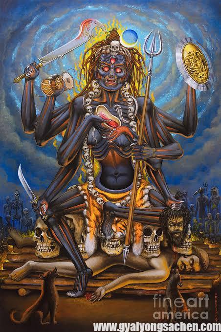 བཤད་སྲོལ་གཉིས་པ་ནི་ཧིན་ཏུའི་ཆོས་ལུགས་ནང་དུ་ཙ་མུན་ཊ་ཞེས་པའི་ནི་ཧིན་ཏུའི་ཆོས་ལུགས་ཀྱི་ལྷ་མོ་དྲག་མོ་ཞིག་ཡིན་པ་དང་། དུར་ཁྲོད་ཀྱི་ལྷ་མོ། མ་ནག་མོ་སྟེ་ཀཱ་ལཱི་ལྷ་མོའི་རྣམ་པ་ཞིག་ཏུའང་བརྩི། ཁོང་ནི་ལྷ་མོ་དུར་ག་ (Durga) ཡི་རྣམ་པ་ཁྲོ་བོའི་ཆ་ཞིག་ཀྱང་ཡིན་པ་བཤད་ཀྱི་འདུག དེ་བཞིན་དུ་རྒྱ་གར་གྱི་ལྷ་ཆེན་ཤི་ཝའི་ཆུང་མ་གཙོ་བོ་གསུམ་ནི། པར་ཝ་ཏི་ (Parvati) དང་། ཀཱ་ལཱི་ (Kali)། ཙ་མུན་ཏྲ་ (Chamunda) བཅས་ཡིན་པ་ཡང་བཤད་འདུག