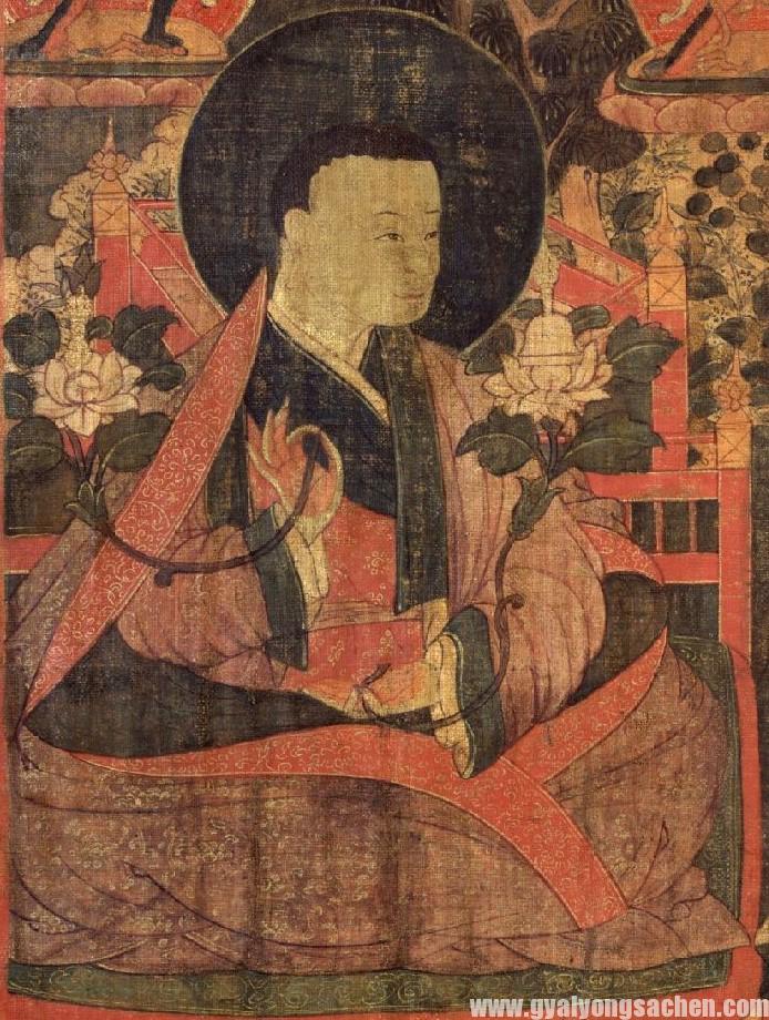 ཡབ་བརྩེ་ཆེན་ཀུན་དགའ་སྙིང་པོ་ཡུམ་དང་བཅས་པས་རིགས་སྲས་བསྐྲུན་པའི་ཆོ་གའི་སྒོ་ནས་ཆུ་ཕོ་ཁྱི།ཕྱི་ལོ་༡༡༤༢ལོར་ངོ་མཚར་བའི་ལྟས་དུ་མ་དང་བཅས་ཆུ་མིག་རྫིང་ཁར་སྐུ་བལྟམས།བལྟམས་མ་ཐག་ནང་དུ་ཏིང་ངེ་འཛིན་གྱི་སྒོ་བསམ་གྱིས་མི་ཁྱབ་པ་ལ་མཉམ་པ་བཞག་ཅིང་སཾསྐྲྀཏའི་སྐད་དང་ལུས་རྡོ་རྗེའི་མདུན་པ་མཛད་དེ་སངས་རྒྱས་འཇིག་རྟེན་དུ་བྱོན་པ་བཞིན་བདག་ནི་བྱིས་པའི་སྤྱོད་པ་ལས་འདས་སོ་ཞེས་ཡང་ཡང་གསུངས།སྐུའི་དགུང་གྲངས་གསུམ་ཉིད་བཞེས་པའི་དུས་ཀྱི་ཚེ་འཕགས་པ་འཇམ་དཔལ་དབྱངས།ཡི་དམ་དགྱེས་པ་རྡོ་རྗེ།རྗེ་བཙུན་སྒྲོལ་མ་ལ་སོགས་པའི་ཡི་དམ་མཐའ་དག་གི་ཞལ་གཟིགས་ཏེ་ལུང་བསྟན་ཕུན་སུམ་ཚོགས་པ་བརྙེས་ཤིང་ཀྱཻ་རྡོར་རྒྱུད་གསུམ།འཁོར་ལོ་བདེ་མཆོག་རྩ་རྒྱུད།ཆོས་མངོན་པ་ཀུན་ལས་བཏུས་པ་སྟེ་ལྔ་ཐུགས་ཐོག་ལ་གསུངས་པ་སོགས་སྐུའི་ན་ཚོ་ཤིན་ཏུ་ཕྲ་བའི་དུས་ནས་ཀྱང་ཆོས་ཕལ་ཆེར་བསླབ་སྦྱངས་མེད་པར་མཁྱེན་པའི་དཀྱིལ་འཁོར་རྒྱས་པའི་ཚུལ་མཛད།ཡབ་ཆེན་རྡོ་རྗེ་འཆང་ཉིད་ལས་བརྒྱུད་པའི་གསང་སྔགས་ཀྱི་ཆོས་དབང་བཞི་མན་ངག་ཟབ་མོ་གྱུར་པ་དེ་དག་བུམ་པ་གང་བྱོའི་ཚུལ་དུ་གསན་ཅིང་དེ་ལ་ཉམས་མྱོང་གྲུབ་པའི་ས་དང་ལྷན་དུ་དེ་དག་ཀུན་ཀྱང་འཆད་པ་ལ་རིགས་དང་གྲོལ་བས་སྨྲ་བའི་སྤོབས་པ་ཆུ་བོའི་རྒྱུན་ལྟ་བུ་ལྷུན་གྱིས་གྲུབ་མཚམས་བཅུ་བདུན་པ་ལ་རྒྱུད་སྡེ་བཞི་ཅུའི་བཤད་པ་ཐུགས་ནསགསུངས་ཤིང་རྒྱུད་མན་ངག་མཐའ་དག་ལ་སྒྲོ་འདོགས་ཆོད་འབྲས་འཕགས་ཡུལ་གྱི་ཆུ་མོ་གངྒཱ་ཚུན་ཆད་རྒྱུད་སྡེའི་ཐེག་པ་མཐའ་དག་ལ་འདི་ཉིད་ལས་མཁས་པ་མེད་དོ་ཞེས་ཕྱོགས་ཀུན་ཏུ་གྲགས་པར་གྱུར།གསང་ཕུར་ཕྱ་པ་ཆོས་ཀྱི་སེང་གེའི་དྲུང་དུ་ཕེབས་ཏེ་བགྲང་བྱ་མི་ལོ་བཅུ་གཅིག་རིང་སྒྲ་ཚད་ལ་སོགས་ཤེས་བྱ་སྡེ་སྣོད་མ་ལུས་པ་ལ་སྦྱོང་ཚུལ་མཛད་པས་ཕྱ་པའི་བུ་ཆེན་ལ།ཇོ་སྲས་བཞི།སེང་ཆེན་བརྒྱད།སེང་འདྲ་བརྒྱད་སོགས་ཇི་སྙེད་ཡོད་པ་ལས་ཇོ་སྲས་བཞི་མཁས་པར་གྲགས་ཤིང་དེ་ལས་ཇོ་སྲས་བསོད་ནམས་རྩེ་མོ་ཆེས་ཆེར་མཁས་སོ་ཞེས་སྙན་པའི་གྲགས་པས་ཁྱབ།རྩ་དྲུག་པ་མེ་མོ་ཕག་ལ་མངའ་རིས་གུང་ཐང་ན་ལ་རྩེ་གནས་གསར་གྱི་གཙུག་ལག་ཁང་དུ་ཆོས་ལ་འཇུག་པའི་སྒོ་ཞེས་བྱ་བའི་བློ་འདས་བསྟན་བཅོམ་ཆེན་མོ་བརྩམས་ཏེ་བསྟན་པའི་རྩིས་ཀྱི་རྣམ་པར་གཞག་པ་སྐྱོན་དང་བྲལ་བ་ཡང་དེའི་བརྗོད་བྱར་བརྒྱན་ཏོ།མདོར་ན་སྐུ་ན་ཕྲ་མོ་ནས་སྐུའི་བཀོད་པ་མ་བསྡུས་ཀྱི་བར་སྐུ་ལ་སྐུ་སྤྱོད་ཉེས་པའི་དྲི་མ་དང་བྲལ།གསུང་ལ་ལོག་སྨྲའི་མཐའ་སྤངས་ནས་བདེན་དོན་གསུངས་པའི་ཡོན་ཏན་གྱིས་བརྒྱན།ཐུགས་ལ་སྤྲོ་པ་མེད་པའི་ཐུགས་སྟོང་ཉིད་སྙིང་པོ་ཅན་གྱི་ནོར་གྱིས་ཕྱུག་གཞན་ལ་ཕན་པ་ལྷུར་ལེན་པའི་མཁྱེན་པའི་སྤྱན་རས་གསལ་བ་དང་ལྡན་པའི་བདག་རྐྱེན་ལས་ཐུབ་པ་དགྱེས
