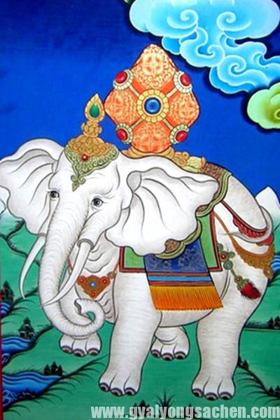 གླང་པོ་རིན་པོ་ཆེ་ནི་ཐལ་དཀར་མཆེ་བ་དྲུག་དང་ལྡན་པ་སྤྱི་གཙུག་དམར་ཞིང་དཔངས་མཐོ་བ། ནོར་བུའི་དྲ་བས་གཡོགས་ཤིང་གླང་ཕལ་བ་སྟོང་གི་སྟོབས་མངའ་བ། ཤིན་ཏུ་མགྱོགས་ཁྱད་དང་ལྡན་པ་གླང་ཆེན་ས་སྲུང་གི་བུ་ལྟ་བུའོ།།