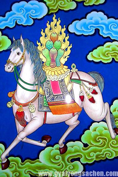 རྟ་མཆོག་རིན་པོ་ཆེ་ནི་མདོག་སྔོན་པོ་རྨ་བྱའི་མགྲིན་པའི་སྤུ་ལྟ་བུ་ཡིད་དུ་འོང་བ། ནད་མེད་ཅིང་འཚེར་སྐད་ཀྱིས་འཛམ་གླིང་ཁྱབ་པ། རྒྱལ་པོའི་ཐུགས་ལ་གང་ཤར་ཤེས་པས་ཅང་ཤེས་པ། འཛམ་གླིང་ཉིན་གཅིག་ལ་ལན་གསུམ་བསྐོར་ནུས་པའི་བང་ཤུགས་རླུང་དང་འདྲ་བ་རྟ་ཡི་རྒྱལ་པོ་ཅང་ཤེས་པ་ལ་ཧ་ལྟ་བུའོ།།