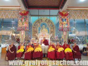 ཕྱི་ཟླ་ ༤ ཚེས་ ༡༢ ཉིན་ ས་སྐྱ་དགོན་སྡེ་ཁག་གི་མཁན་་ལས་ཟུར་རྣམ་པ་དང་། དེ་བཞིན་དགའ་ལྡན་དང་འབྲས་སྤུངས་སོགས་གདན་ས་ཁག་གི་མཁན་ལས་ཟུར་དང་སྤྲུལ་པའི་སྐུ་རྣམ་པ་དབུས་དད་ལྡན་མང་ཚོགས་ལ་ཀུན་རིག་གི་དབང་དང་། ཕྱི་ཚེས་ ༡༠ ཉིན་ ས་སྐྱ་བརྩེ་ཆེན་དམ་ཆོས་གླིང་དགོན་པའི་ནང་། རྒྱ་གར་ལྷོ་ཕྱོགས་སུ་ཡོད་པའི་ས་སྐྱའི་དགོན་ཁག་གསུམ་དང་མོན་གྷོ་འདོད་རྒུ་གླིང་སེར་སྐྱ་མི་དམངས་ཡོངས་ནས་༧གོང་མ་ཁྲི་ཆེན་རིན་པོ་ཆེ་མཆོག་སྐུ་ཚེ་ཡུན་དུ་བརྟན་པའི་བརྟན་བཞུགས་བསྟར་འབུལ་ཞུས་འདུག། ས་སྐྱ་གོང་མ་ཁྲི་ཆེན་རིན་པོ་ཆེ་མཆོག་ཕྱི་ཚེས་ ༡༨ བར་མོན་གྷོ་འདོད་རྒུ་གླིང་དུ་བཞུགས་བཞག་མཛད་འཕྲིན་སྐྱོང་གནང་མཛད་ཀྱི་འདུག།