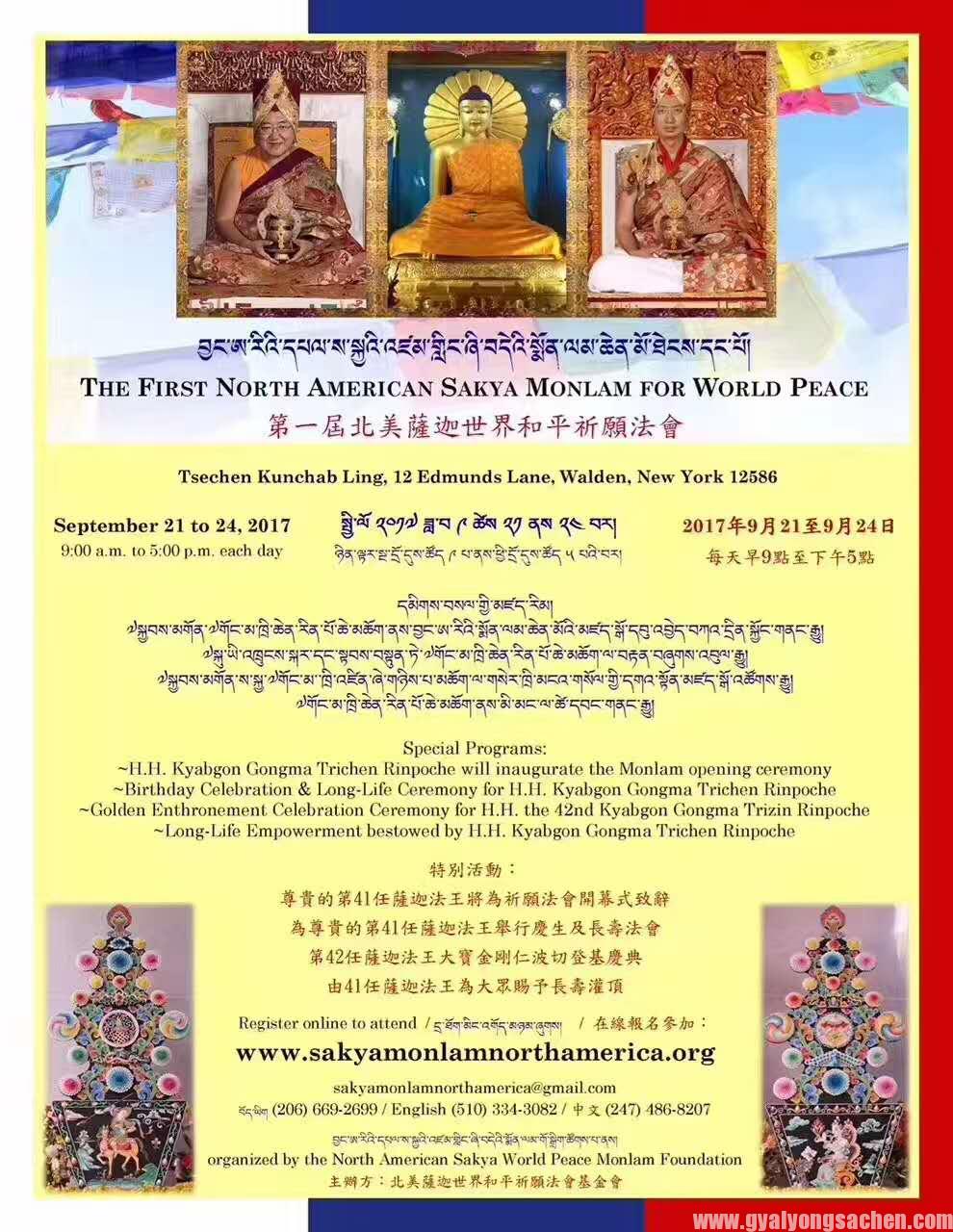 སྤྱི་ལོ་༢༠༡༧ སྤྱི་ཟླ་ ༩ ཚེས་༢༡ ནས་༢༤ བར་བྱང་ཨ་རིའི་གདན་ས་བརྩེ་ཆེན་ཀུན་ཁྱབ་གླིང་དུ་དཔལ་ས་སྐྱའི་༸སྐྱབས་མགོན་༸གོང་མ་ཁྲི་ཆེན་རྡོ་རྗེ་འཆང་ཆེན་པོ་མཆོག་དབུ་བཞུགས་ཐོག་བྱང་ཨ་རིའི་དཔལ་ས་སྐྱའི་འཛམ་གླིང་ཞི་བདེའི་སྨོན་ལམ་ཆེན་མོ་ཐེངས་དང་པོ་ཚོགས་རྒྱུ་ཡིན་འདུག