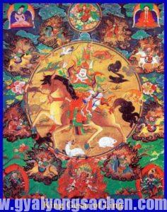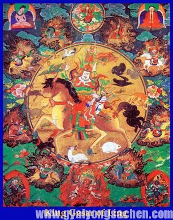 དེ་ཉིད་ཀྱི་གྲོགས་སུ་ཛམ་ལྷའི་རྣམ་སྤྲུལ་སྐྱ་ལོ་སྟོན་པ་རྒྱལ་མཚན་གྱི་སྲས་མོ་སྒ་སྐྱ་ལོའི་སེང་ལྕམ་འབྲུག་མོ་ཞེས་རྗེ་བཙུན་སྒྲོལ་མ་དཀར་མོའི་རྣམ་འཕུལ་དེ་ཉིད་ཁབ་ཏུ་བཞེས་ནས་གསང་བའི་གཟུང་མར་མངའ་གསོལ། དེ་ནས་ཕ་ཁུ་མཆེད་གསུམ་དང་། གར་པ་མཆེད་གསུམ། ཁྲ་གླག་སྤྱང་གསུམ། ཐུལ་ཕྲན་མི་བདུན། ཕུ་ནུ་སུམ་ཅུ་ཐམ་པ་བཅས་སྔར་རྒྱུན་བཞིན་སོ་སོར་དཔོན་ཐོབ་གོ་གནས་རང་འཇགས་ཐོག་ཕྱོགས་བཞིའི་ས་མཚམས་སུ་སྲུང་དམག་དང་བཅས་པ་འཇོག་པར་མཛད་ཅིང་དྲག་པོས་དམག་གི་བསྟན་པ་སྤེལ། རེ་ཞིག་གི་བར་ཟ་མཁར་རིང་མོའི་ནང་དུ་རྩ་གསུམ་བསྙེན་བསྒྲུབ་བཅད་རྒྱལ་བཞུགས། དགུང་ལོ་བཅོ་ལྔ་ལ་ཕེབས་པ་ཆུ་ཕོ་འབྲུག་གི་ལོར། རྩ་གསུམ་ལྷ་དང་ཌ་ཀིའི་ཐུགས་རྒྱུད་བསྐུར་ཞིང་བྱང་བདུད་ཀླུ་བཙན་འདུལ་བར་ཕེབས། ཡར་ལམ་བདུད་ཀྱི་སྒོ་སྲུང་གཟུགས་ཅན་གཟུགས་མེད་ཀྱི་བདུད་རིགས་རྣམས་བརྟུལ་ཞིང་ལམ་དུ་ཟླ་བ་གསུམ། བདུད་ཡུལ་དུ་ཕེབས་ནས་སྤྲུལ་པའི་ངང་ཟླ་བ་གསུམ་བཞུགས། ཞག་པོ་དགུ་བཅུ་གོ་དགུའི་སྟེང་བདུད་རྗེ་བརྟུལ། བདུད་ཡུལ་ཆོས་ལ་བསྒྱུར་ཞིང་། ཁ་གནོན་མཆོད་རྟེན་བཞེངས་རྒྱུ་སོགས་ཀྱི་སླར་ཡང་ལོ་གཅིག་བཞུགས་རྒྱུའི་ཐུགས་བཞེད་གནང་། འོན་ཀྱང་ལས་ཀྱི་མཁའ་འགྲོའམ། རྡོ་རྗེ་ཁྲོས་མ་ནག་མོའི་སྐྱེ་མཐའ་མེར་གཟའ་ནས་རྟེན་འབྲེལ་ཅུང་འཆུག་པའི་དབང་གིས་བདུད་ཀྱི་དམ་གྲིབ་དང་། བརྩོག་མནོལ་ཟས་གྲིབ་ཀྱི་རྣམ་པའི་རྐྱེན་གྱིས་ཟག་མེད་ཀྱི་ཏིང་ངེ་འཛིན་གྱི་ངང་དུ་ལོ་བདུན་རིང་བཞུགས། ཆོས་ལ་བསྒྱུར་བ་ལོ་གཅིག་ཙམ་འགོར། ཡར་ལམ་མར་ལམ་ཟླ་བ་དྲུག་བཅས་ཁྱོན་བདུད་ཡུལ་ལ་ཕེབས་ནས་གླིང་ཡུལ་མ་ཕེབས་བར་ལོ་དགུ་རིང་འགོར། གེ་སར་བདུད་ཡུལ་དུ་ཕེབས་ནས་ལོ་གཅིག་སོང་རྗེས་སེར་པོ་ཧོར་གྱི་དམག་སྣ་གླིང་ཕྱོགས་སུ་བསྟན་ཅིང་ཧོར་གླིང་གཡུལ་འགྱེད་ཀྱི་འགོ་ཚུགས། ལོ་དྲུག་གི་རིང་དམག་འཁྲུག་བྱས་པས་མཐར་ཧོར་གྱི་རྒྱལ་ཁ་ཐོབ། གེ་སར་གླིང་ཡུལ་དུ་ཕེབས་ནས་ལོ་གཅིག་གི་རྗེས་ཧོར་ཡུལ་དུ་ཕེབས་ནས་ཧོར་གྱི་རྒྱལ་བློན་ཚང་མ་བརྟུལ། ཧོར་ཡུལ་ཆོས་ལ་བསྒྱུར། དེ་ནས་བཟུང་། འཇང་དང་། ཤིང་ཁྲི། སྟག་གཟིགས་སོགས་བདུད་ཀྱི་སྡེ་ཆེན་པོ་བཞི། བྱེ་རི། ཨ་གྲགས། སོག་སྟོད་སྨད་བར་གསུམ། ཁ་ཆེ། གྲུ་གུ་ཞང་ཞུང་། མི་ཉག རྒྱ་ནག རི་ནུབ་སོགས་བོད་ཀྱི་མཐའ་མཚམས་བདུད་རྒྱལ་ཁག་དང་། གཞན་ཡང་ཕྱིའི་རྒྱལ་ཁག་སོགས་རྫོང་ཆེན་བཅོ་བརྒྱད། རྫོང་ཕྲན་བཅུ་གཉིས་དང་བཅས་པ་ལ་ཐབས་ཞི་བའི་སྒོ་ནས་དབང་དུ་བསྡུ་བ་དང་། ཕལ་ཆེར་མངོན་སྤྱོད་དྲག་པོའི་ནག་ཕྱོགས་བདུད་ཀྱི་རྗེ་འབངས་འཁོར་དང་བཅས་པ་མིང་མེད་རྩ་བརླག་ཏུ་བཏང་ནས། སངས་རྒྱས་ཀྱི་བསྟན་པ་འཛམ་གླིང་ཡུལ་གྲུ་མཐའ་དབུས་ཀུན་ཏུ་ཁྱབ་བརྡལ་དུ་སྤེལ་ཞིང་། དཀར་ཕྱོགས་ཀྱི་དབུ་འཕང་དགུ