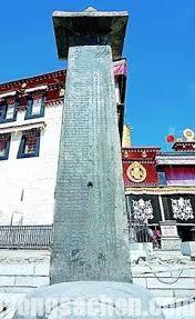 ཙུག་ལག་ཁང་མདུན་གྱི་རྡོ་རིང་ཡི་གེའམ་ཐང་བོད་དབོན་ཞང་གཉིས་མཇལ་དུམ་མཛད་པའི་རྡོ་རིང་གི་ཡི་གེ་ཡང་ཟེར། ཕྱི་ལོ་བརྒྱད་བརྒྱ་ཉེར་གསུམ་ལོར་རྡོ་རིང་འདི་ལྷ་སའི་གཙུག་ལག་ཁང་གི་མདུན་གྱི་ཇོ་བོའི་དབུ་སྐྲ་ཟེར་བའི་ལྕང་སྡོང་གི་འཁྲིས་སུ་བཙུགས་ཏེ་བོད་བཙན་པོའི་རྒྱལ་ཁབ་དང་ཐང་རྒྱལ་རབས་བར་གྱི་མཛའ་མཐུན་ཆེ་བའི་འབྲེལ་བ་སྔར་ལས་ཆེ་བ་རྡོ་ཐོག་རི་མོ་བྲིས་པ་བཞིན་འགྱུར་རོ།། ནུབ་ངོས་ཀྱི་གཡོན་ཕྱོགས། ༄།། བོད་ཀྱི་རྒྱལ་པོ་ཆེན་པོ་འཕྲུལ་གྱྀ་ལྷ་བཙན་པོ་དང་།། རྒྱའྀ་རྒྱལ་པོ་ཆེན་པོ་རྒྱ་རྗེ་ཧྭང་ཏི། དབོན་ཞང་གཉིས།། ཆབ་སྲིད་གཅྀག་དུ་མོལ་ནས།། མཇལ་དུམ་ཆེན་པོ་མཛད་དེ་གཙྀགས་བཅས་པ།། ནམ་ཞར་ཡང་མྱྀ་འགྱུར་པར། ལྷ་མྱྀ་ཀུན་གྱྀས་ཤེས་ཤིང་དཔང་བྱས་ཏེ་ཚེ་ཚེ་རབས་རབས་སུ་གཏམ་བརྗོད་དུ་ཡོད་པའྀ་ཕྱིར།། མཇལ་དུམ་གྱི་གཙིགས་ཀྱྀ་མདོ་རྡོ་རིངས་ལ་བྲིས་པའོ། ༄།། འཕྲུལ་གྱྀ་ལྷ་བཙན་པོ་ཁྲི་གཙུག ལྡེ་བཙན་གྱྀ་ཞ་སྔ་ནས།། རྒྱ་རྗེ་བཱུན་བཱུ་ཧེའུ་ཏིག་ཧྭང་ཏེ་དང།། དབོན་ཞང་གཉིས།། སྒམ་དཀྱེལ་ཆེན་པོས་ ནི།། འཕྲལ་ཡུན་ཡུལ་གྱྀ་ལེགས་ཉེས་ཅྀ་ཡང་བསྲུང་སྟེ།། ཐུགས་རྗེ་ཆེན་པོས་ནྀ། བཀའ་དྲྀན་གྱིས་དགབ་པ་ལ་ཕྱྀ་ནང་མྱེད་པར།། མང་པོ་ཀུན་བདེ་སྐྱིད་པར་བྱ་བ་ལ་ནྀ་དགོངས་པ་གཅྀག ཡུན་རྀང་པོར་ལེགས་པའྀ་དོན་ཆེན་པོ་ལ་ནི་བཀའ་གྲོས་མཐུན་ཏེ།། གཉེན་རྙིང་པའྀ་སྲི་ཞུ་ལ་ནྀ་དང་སྔའི་ཁྱྀམ་ཚེས་དགྱེས་པའི་ཚུལ་སླར་དུ་བརྩེགས་པར་མོལ་ནས།། མཇལ་དུམ་ཆེན་པོ་ནི་མཛད་དེ།། བོད་རྒྱ་གཉིས།། ད་ལྟར་དུ་མངའ་བའྀ་ཡུལ་དང་མཚམས་སྲུང་ཞིང།། དེའི་ཤར་ཕྱོགས་ཐམས་ཅད་ནྀ་རྒྱ་ཆེན་པོའི་ཡུལ།། ནུབ་ཕྱོགས་ཐམས་ཅད་ནྀ་ཡང་དག་པར་བོད་ཆེན་པོའི་ཡུལ་ཏེ།། དེ་ལས་ཕན་ཚུན་དགྲར་མྱྀ་འཐབ།། དམག་མྱྀ་དྲང། ཡུལ་མྱྀ་མརྣམ།། ཡྀད་མ་ཆེས་པ་ཞྀག་ཡོད་ན།། མྱྀ་བཟུང་ཞིང་གཏམ་དྲྀས་ཏེ།། བརྫངས་ནས་ཕྱྀར་གཏང་ངོ།། ད་ཁྱབ་སྲྀད་གཅིག་ཅྀང།། མཇལ་དུམ་ཆེན་པོ་འདྀ་ལྟར་མཛད་པས།། དབོན་ཞང་དགྱེས་པའི་བཀའ་ཕྲིནད་སྙན་པས་ཀྱང་འདྲུལ་དགོས་ཏེ།། ཕན་ཚུན་གྱྀ་ཕོ་ཉ་འདོང་བ་ཡང།། ལམ་རྙིང་པར་བྱུང་ནས།། སྔ་ལུགས་བཞིན་བོད་རྒྱ་གཉིས་ཀྱྀ་བར།། ཙང་ཀུན་ཡོག་རྟ་བརྗེས་ལ།། སྩེ་གཞུང་ཆེག་དུ་རྒྱ་དང་ཕྲད་པ་མན་ཅད་ནྀ་རྒྱས་ཕུ་དུད་བྱ།། ཙེང་ཤུ་ཧྱྭན་དུ་བོད་དང་ཕྲད་ཡན་ཅད་ནྀ་བོད་ཀྱིས་ཕུ་དུད་བྱ་སྟེ།། དབོན་ཞང་ཉེ་ཞྀང་གཉེན་བའྀ་ཚུལ་བཞིན་དུ།། སྲྀ་ཞུ་དང་བཀུར་སྟྀའི་ལུགས་ཡོད་པར་སྦྱར་ཏེ།། ཡུལ་གཉིས་ཀྱི་བར་ན་དུད་རྡུལ་ནྀ་མྱི་སྣང།། གློ་བུར་དུ་སྡང་བ་དང་དགྲའི་མྱྀང་ནྀ་མྱི་གྲག་སྟེ་ས་མཚམས་སྲུང་བའྀ་མྱི་ཡན་ཅད་ཀྱང་དོགས་ཤིང་འཇིགས་པ་མྱེད་པར་ས་ས་མལ་མལ་ན་བག་བརྐྱང་སྟེ།། བདེ་བར་འཁོད་ཅྀང།། སྐྱིད་པའྀ་བཀའ་དྲྀན་ནི་རབས་ཁྲ