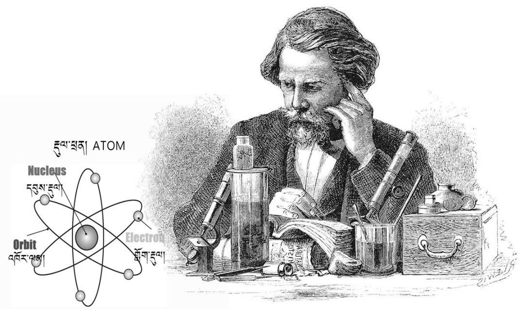 འོ་ན། ཚན་རིག་པས་སྨྲ་བའི་རྡུལ་ཕྲན་གྱི་ངོ་བོ་གང་ཡིན་ཞེ་ན། དེ་ལ་ཚན་རིག་པས་རྡུལ་ཕྲན་ལ་ཨེ་ཏྲོམ་( Atom) ཟེར་ཞིང༌། རྡུལ་ཕྲན་( Atom) ནི་ཆ་རྡུལ་མང་པོ་འདུས་པའི་གོང་བུ་གཅིག་ལ་གོ་དགོས། ཕལ་ཆེར་ནང་པའི་གྲུབ་མཐའ་སྨྲ་བའི་ངོས་ནས་བལྟས་ན་བསགས་རྡུལ་གཅིག་ལ་གོ་ན་མི་འགྲིག་པ་མེད་སྙམ། དེ་ལ་རྡུལ་ཕྲན་( Atom) ནི་རང་ཉིད་ཀྱི་རྩོམ་གཞིའི་རྡུལ་དབུས་རྡུལ་( ནེའུ་ཁེལ་ལེ་སེ་Nucleus) དང་གློག་རྡུལ་( ཨེ་ལེཀ་ཏྲོན་Electron ) གཉིས་འདུས་པ་ལས་གྲུབ་པའི་གོང་བུ་ཞིག་ལ་ཟེར་ཞིང༌། དེ་གཉིས་འདུས་ནས་གོང་བུའི་ངོ་བོར་གྲུབ་ཚུལ་ནི། དབུས་རྡུལ་( Nucleus) དེ་ཉིད་དཀྱིལ་དུ་གནས་ཡོད་ཅིང༌། དེའི་མཐའ་བསྐོར་དུ་གློག་རྡུལ་( Electron) གྱིས་འཁོར་བསྐྱོད་བྱེད་བཞིན་པའི་གོང་བུ་ལ་རྡུལ་ཕྲན་(Atom ) ཞེས་བརྗོད། གློག་རྡུལ་( Electron) གྱིས་དབུས་རྡུལ་ལ་( Nucleus) འཁོར་བསྐྱོད་བྱེད་སྐབས་བར་དང་བཅས་པའི་སྒོ་ནས་བྱེད་བཞིན་ཡོད་པའི་འགྲེལ་བརྗོད་བྱེད། གཤམ་གྱི་དཔེ་རིས་ལ་ལྟོས།