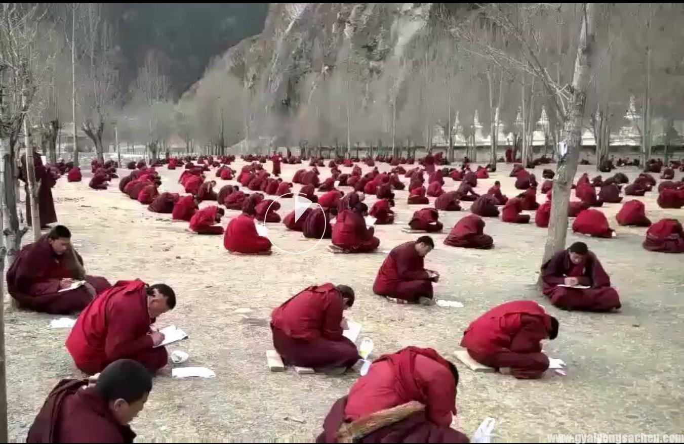 དེ་རིང་ནས་བཟུང་བོད་ཡུལ་ཁམས་བྱེ་སྡེ་དགེ་རྫོང་གསར་བཤད་གྲྭ་ཆེན་མོ་ལྔ་རིག་ཐུབ་བསྟན་དར་རྒྱས་སློབ་གླིང་གི་སློབ་གཉེར་བ་རྣམས་ཀྱིས་ལོ་མཇུག་གི་ཡིག་ཚད་ཉིན་གསུམ་གྱི་རིང་དུ་བྲིས་རྒྱུགས་སྤྲོད་བཞིན་པ་དང་རྒྱུགས་ལེན་པ་རྫོང་གསར་མཁན་ཆེན་མཆོག་དང་ཝཱ་ར་བཤད་གྲྭའི་ལས་ཐོག་མཁན་ཆེན། དུང་མདོ་བཤད་གྲྭའི་ལས་ཐོག་མཁན་ཆེན། འགུ་ཟི་མཁན་པོ། ཤུག་ར་མཁན་པོ། བཅས་གཟིགས་ཀྱིས་ཞིབ་གནང་བཞིན་པའི་ཆོས་གྲྭ་ཆེན་མོའི་ནང་གི་ཟུར་ཞིག་གི་རྣམ་པ།