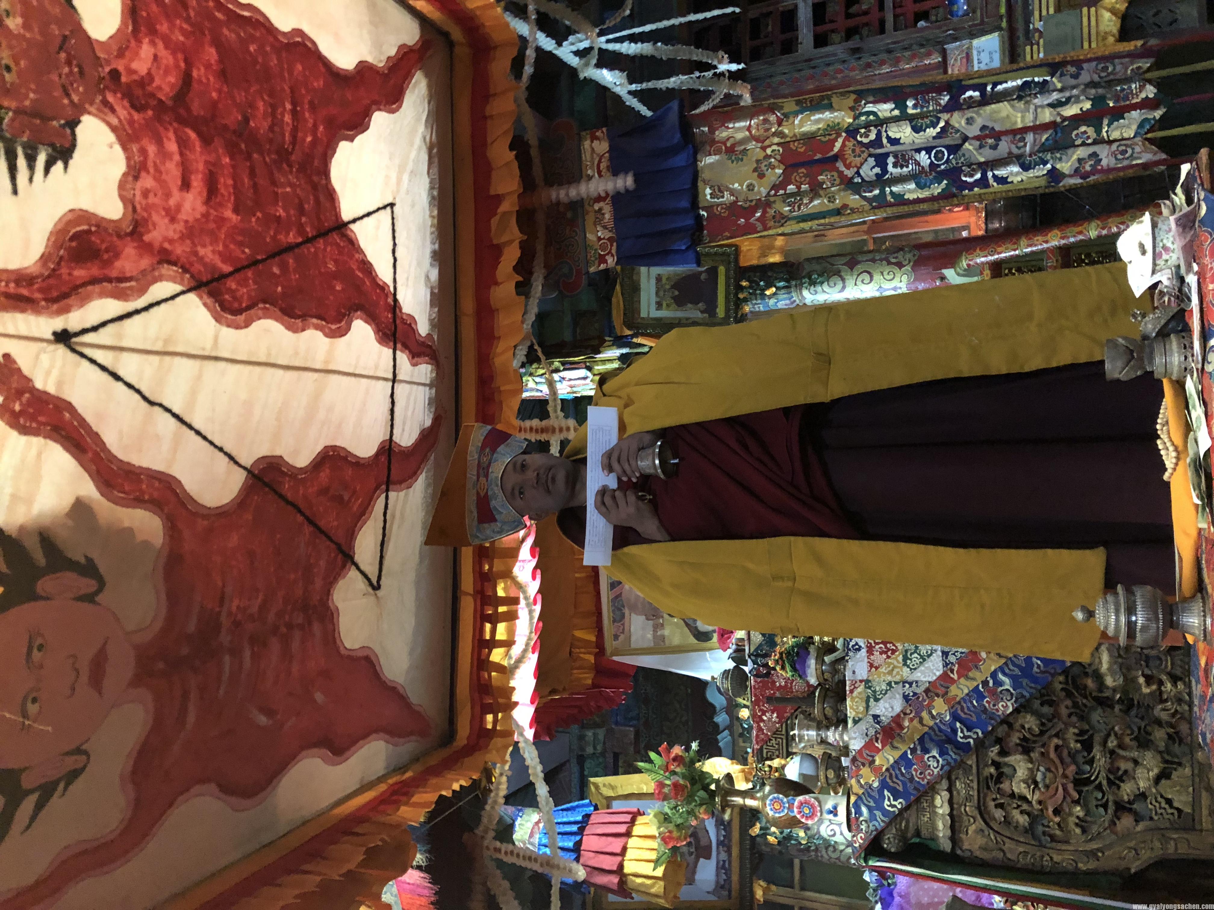 ཉིན་རྗེས་མ་དེར་དངོས་སུ་དཔོན་སློབ་སྐུ་འཁོར་དང་བཅས་པས་འཕེན་གཏོར་གནང་བ་དང་། དགེ་རྩ་རྫོགས་བྱང་དུ་བསྔོ་བའི་སྐྱབས་འཇུག་གནང་སྲོལ་ལྟར་ད་ལྟའི་བར་དུ་ཕྱག་སྲོལ་གནང་མུས་མཆིས།