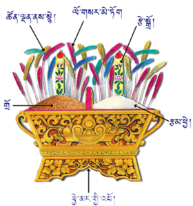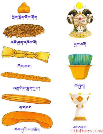 སྡེར་ཁར་བཤམས་པའི་ཁ་བཟས་ཀྱི་བཟོ་དབྱིབས་མི་འདྲ་བ་སྟེ། ཁོར་ཁོག་ལས་རྐང་གདུང་དང་། ཉ་ཤག་ལས་རྩིབས་མ། སྨུག་ཐུང་ལས་རྒྱུ་ནག སྦོ་ལུག་ལས་རྒྱུ་དཀར། པིན་ཏོག་ལས་སྙིང་བཅས་མཚོན་ཐུབ་ཀྱི་ཡོད། ཅེས་དམངས་ཁྲོད་དུ་བཤད་སྲོལ་ཡོད། དེ་ལྟར་ན་སྡེར་ཁ་ཡང་ཐོག་མར་དམར་མཆོད་འབུལ་བྱེད་ཡིན་པ་བརྗོད་མེད་རེད། འོན་ཀྱང་ད་ལྟ་གཙོ་བོ་རྟེན་འབྲེལ་མཚོན་བྱེད་རེད། དཔེར་ན། ཁ་བཟས་བཟོ་རྒྱུའི་རྒྱུ་ནི་གྲོ་ཞིབ་ཡིན་པའི་གྲོ་ནི་ཁ་གྲོ་བའི་དོན་དང་ལྡན་ཡོད། བསྲེག་ས་ནི་མར་རམ་སྣུམ་ཡིན་པས་སྣུམ་ཞག་ལྡན་པ་ནི་བོད་མིས་ལེགས་པའི་ཆར་བརྩི་སྲོལ་ཡོད་པ་སྟེ། མི་སྣུམ་ཞག་དོད་པོ་དང་། ལུང་པ་སྣུམ་ཞག་དོད་པོ་སོགས་ཀྱི་བཤད་སྲོལ་ཡོད། དེ་མིན་སྡེར་ཁའི་ཁ་བཟས་ཀྱི་གྲངས་ཀྱང་ངེས་པར་རྟེན་འབྲེལ་མཚོན་བྱེད་དུ་ཡ་གྲངས་ཡིན་དགོས་པ་སྟེ། དགུ་བདུན་ལྔ་གསུམ་གང་རུང་དུ་བརྩེགས་པ་དང་། ཤིང་འབྲས། འབྲུ་སྣ་སོགས་སྣོད་བཟང་དུ་བསྒྲིགས་ནས་རྟེན་འབྲེལ་གྱི་རྫས་ལ་བརྩི་སྲོལ་ཡོད་པ་བཅས་ཀྱི་ཐོག་ནས་སྡེར་ཁ་ནི་རྟེན་འབྲེལ་མཚོན་བྱེད་ཡིན་པ་ར་སྤྲོད་ཐུབ་ཀྱི་རེད། སྡེར་ཁ་སྒྲིག་སྲོལ་ཡང་ཡུལ་ལུང་སོ་སོར་གོམས་གཤིས་ཅུང་མི་འདྲ་བ་རེ་ཡོད་དེ། དབུས་ཁུལ་ཏུ་སྡེར་ཁའི་ཁ་བཟས་ཁ་ཕུབ་ནས་བསྒྲིགས་པ་དང་། གཙང་ཁུལ་དུ་ཁ་ཟས་ཁ་བསླངས་ནས་སྒྲིག་སྲོལ་ཡོད།