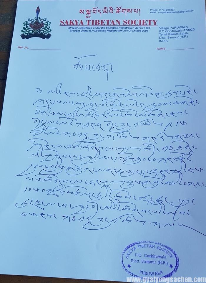 དཔལ་༧སྐྱབས་མགོན་༧ས་སྐྱ་༧ གོང་མ་ཁྲི་འཛིན་རིན་པོ་ཆེ་མཆོག་གིས་སྤྱི་ལོ་༢༠༡༨ དང་འདི་ཟླ་བའི་སྤྱི་ཚེས་ ༢༤ སྔ་དྲོ་ཆུ་ཚོད་༡༠ པའི་ཐོག་སྤུ་རུ་ཝ་ལ་ས་སྐྱའི་གཞིས་ཆགས་སུ་རྟེན་གཞི་བྱས་པའི་ས་སྐྱ་མ་དགོན་བཤད་གྲྭ་ཐུབ་བསྟན་རྣམ་རྒྱལ་གླིང་གི་གཙུག་ལག་ཁང་དུ་དད་ལྡན་མི་མང་ཡོངས་ལ་ཆོས་འབྲེལ་རྟ་ཕྱག་ཁྱུང་གསུམ་གྱི་བཀའ་དབང་བསྩལ་གཏན་འཁེལ་བས་ཆོས་བརྡ་གསལ་བསྒྲགས་སུ།