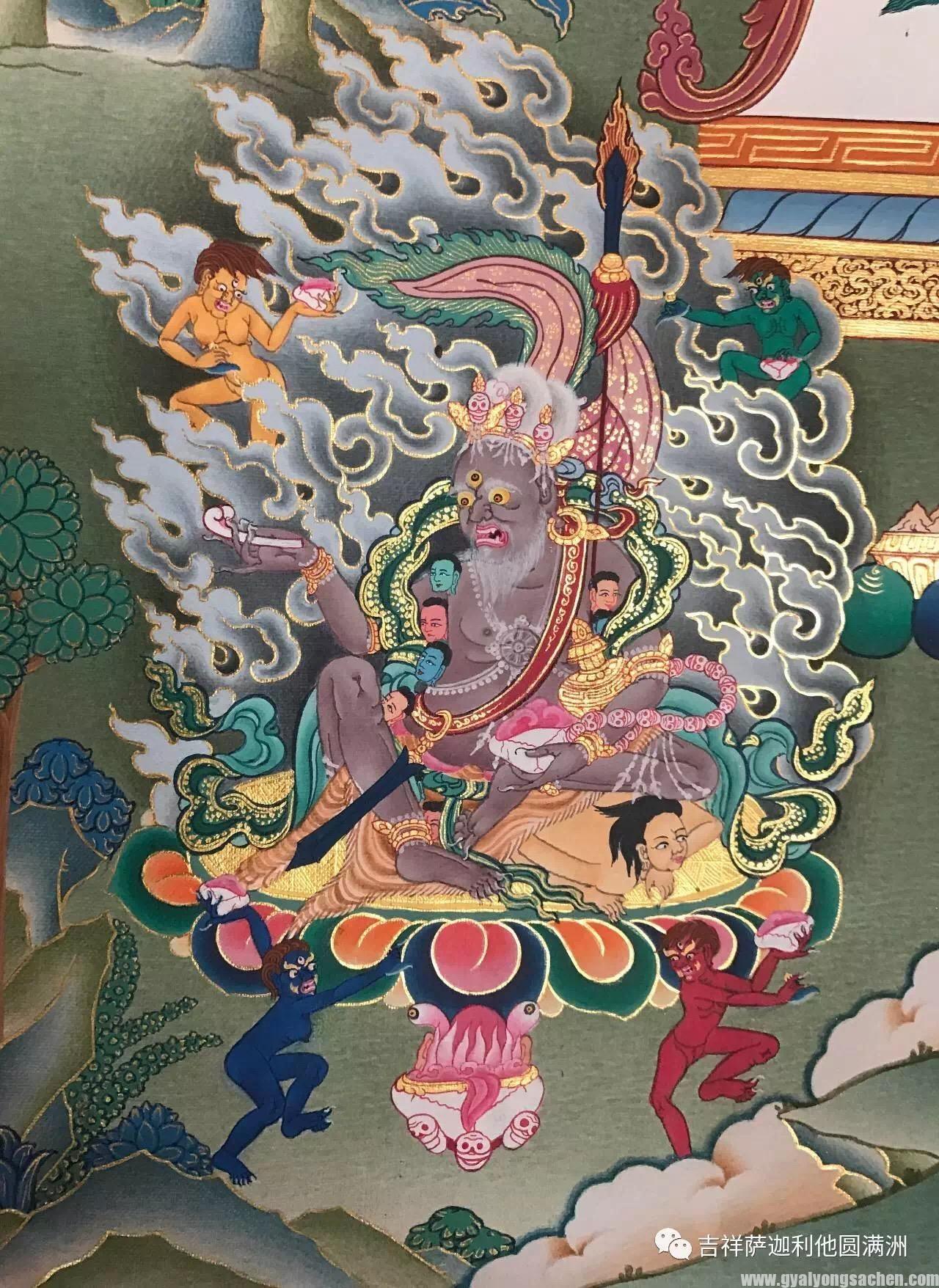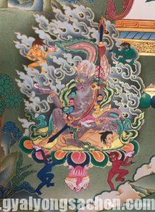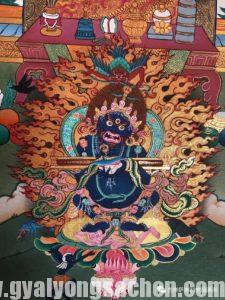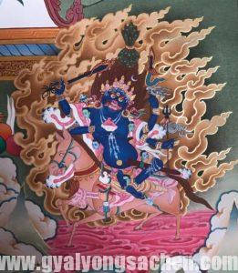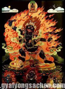 བླ་མ་དང་དཔལ་རྡོ་རྗེ་མཁའ་འགྲོ་ལ་ཕྱག་འཚལ་ལོ། །རབ་འབར་བསྐལ་པའི་མེ་དཔུང་ཀློང་དཀྱིལ་ན། །རབ་འཇིགས་གཟུགས་ཐུང་མདོག་ནག་ཆེར་འབར་ཞིང་། །རབ་གསལ་སྤྱན་གསུམ་མེ་སྟག་ལྟ་བུར་འཕྲོས། །རབ་གདངས་ཞལ་དམར་རྣམ་པར་གཡོ་ལ་འདུད། །ཤིན་ཏུ་རྒྱས་པའི་ཕྱག་གཉིས་ཐུགས་ཁར་ནི། །གྲི་གུག་ཐོད་པ་རྣམ་འཕྲུལ་གཎྜི་བསྣམས། །ཟླུམ་པོའི་སྟབས་ཀྱིས་ཞབས་གཉིས་དགྲ་བགེགས་ཀྱི། །སྙིང་ཁར་བརྡབས་པས་ས་གསུམ་གཡོ་ལ་འདུད། །རབ་མཛེས་རིན་ཆེན་དར་གྱི་ཅོད་པཎ་བཀླུབས། །མི་སྡུག་སྦྲུལ་དང་རུས་པའི་རྒྱན་ཆ་འཁྲོལ། །འཇིགས་རུང་ཁྲག་འཛག་མགོ་བོའི་དོ་ཤལ་བྱས། །དཔའ་བོ་སྟག་གི་ཤམ་ཐབས་ཅན་ལ་བསྟོད། །རིགས་ལྔའི་ངོ་བོ་ཁྱུང་ཆེན་ནམ་མཁར་སྤྲོ། །བྱ་ནག་གཤོག་བསྐོར་ཁྱི་ནག་འཁང་ཞིང་ཟུག །ལྕེ་སྤྱང་འབྲོས་འདེད་མི་ནག་བཤུགས་གླུ་ལེན། །སྤྲུལ་པའི་ཕོ་ཉས་དགྲ་བགེགས་སྒྲོལ་ལ་འདུད། །ཧ་ཧ་འདོད་ཁྲོ་རྨོངས་པའི་གྲོང་ཁྱེར་བསྒྱེལ། །