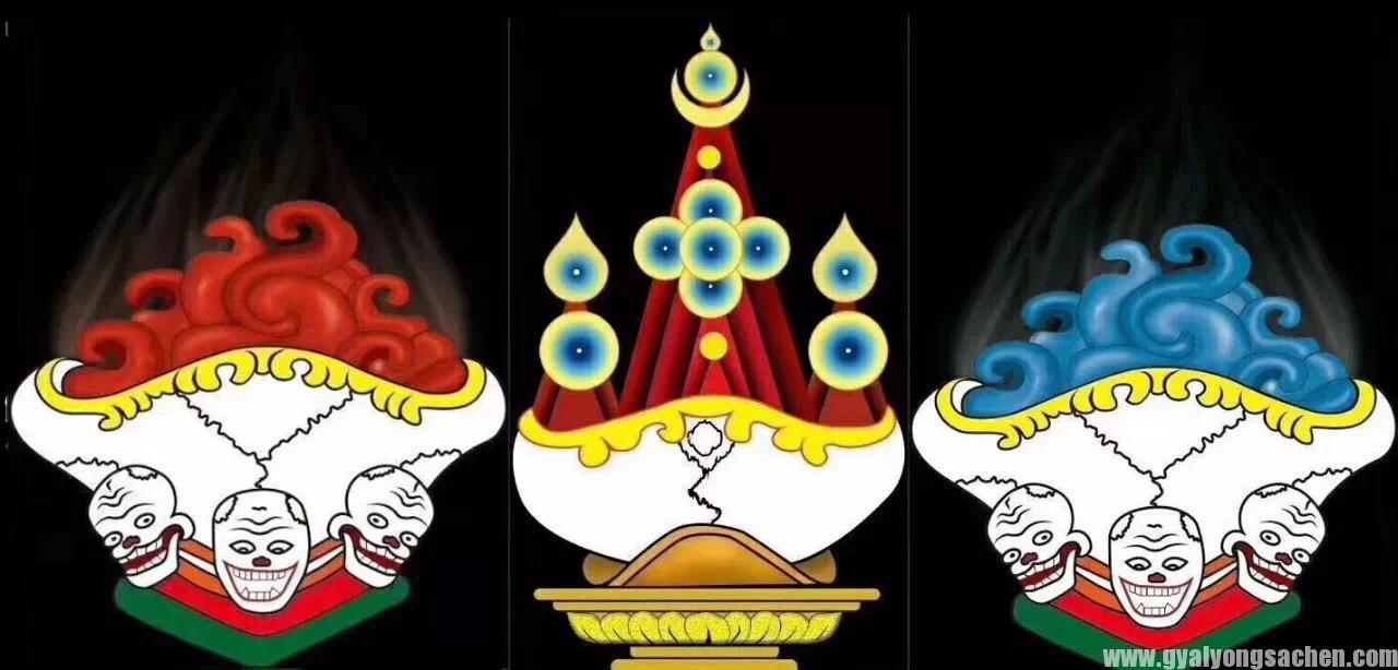 དམ་རྫས་སྤྱན་གཟིགས་མཆོད་པ་འདི་བཞེས་ལ། །བླ་མ་རྡོ་རྗེ་འཛིན་པས་བཀའ་བསྒོས་ལྟར། །རྣལ་འབྱོར་བདག་ཅག་དཔོན་སློབ་འཁོར་བཅས་ཀྱི། །ནད་དང་གདོན་དང་གཞན་གྱི་བྱད་ཁ་སོགས། །དམ་ཆོས་བསྒྲུབ་པའི་འགལ་རྐྱེན་ཀུན་ཞི་ནས། །ཚེ་དང་བསོད་ནམས་འཁོར་དང་ལོངས་སྤྱོད་སོགས། །མཐུན་རྐྱེན་མ་ལུས་ཕུན་སུམ་ཚོགས་པར་མཛོད། །བསྟན་འཛིན་ཐམས་ཅད་སྐུ་ཚེ་བརྟན་པ་དང་། །བསྟན་པ་རིན་ཆེན་ཕྱོགས་བཅུར་རྒྱས་པ་དང་། །བསྟན་ལ་གནོད་བྱེད་དགྲ་བགེགས་འདུལ་བ་དང་། །བསྟན་པས་ཁྱབ་པའི་འགྲོ་རྣམས་བདེ་བར་མཛོད། །དཔལ་ས་སྐྱ་པའི་བཀའ་སྲུང་རྣམས་ལ་བསྟོད་པ་རྣམ་པར་རྒྱལ་བའི་རྔ་ཆེན་ཞེས་བྱ་བ་འདི་ནི། །
