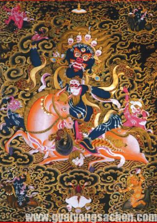 དཔལ་ལྡན་ལྷ་མོའི་སྐུ་མདོག་སྔོན་ཞིང་ཞལ་གཅིག་ཕྱག་གཉིས་དང་ལྡན་པ།ཆིབས་དྲེལ་རག་དམར་གྱི་སྟེང་དུ་འཕུར་ཞིང་བགྲོད་པ་དང་།མཐའ་འཁོར་དུ་མེ་དཔུང་དང་རླུང་འཚུབ་འཁྲིགས་པ།ཕྱག་གཡས་པས་བེ་ཅོན་དང་གཡོན་པས་ཁྲག་གིས་བཀང་བའི་ཀ་པཱ་ལ་བསྣམས་ཡོད།མི་མགོ་སྐམ་པོའི་དབུ་རྒྱན་དང་ཟླ་བ་དང་རྨ་བྱའི་གདུགས་དང་ཕྱག་རྒྱ་ལྔ་དང་དུག་སྤྲུལ་དང་སྟག་ལྤགས་སོགས་ཀྱིས་བརྒྱན་པ།ཕྱི་ཤ་ལ་མཚོན་གྱི་གྲུ་གུ་དང་བཙན་གྱི་ཤོ་རྡེལ་དཀར་ནག་བཏགས་པའོ།།སྲུང་མ་འདི་ཉིད་ངེས་པར་དོན་དུ་རྒྱལ་བ་རྡོ་རྗེ་འཆང་གི་ཡུམ་རྡོ་རྗེ་དབྱིངས་ཀྱི་དབང་ཕྱུག་མ།འཇིགས་བྱེད་ཀྱི་ཡུམ་རྡོ་རྗེ་རོ་ལངས་མ།རྗེ་བཙུན་སྒྲོལ་མ་དཀར་ལྗང་དམར་སེར་དང་འཕགས་མ་དབྱངས་ཅན་མ་སོགས་དང་ངོ་བོ་གཅིག་ལ།འདིའི་འཁོར་དུ་གཙོ་བོར་བཀའ་གདམས་སྒྲོལ་མ་བཅུ་གཉིས་དང་བསྟན་མ་བཅུ་གཉིས་དང་བཅས་པ་ཡོད།འདིའི་གདམས་པ་རྒྱལ་བོ་རྡོ་རྗེ་འཆང་གིས་བྲམ་ཟེ་ས་ར་ཧ་ལ་གནང་ཞིང་།ཕ་དམ་པ་སངས་རྒྱས་ཀྱིས་བོད་ཡུལ་ལ་སྤྱན་དྲངས།དེའི་ཕྱིས་སུ་ཆོས་སྐོར་གྱི་འཕྲིན་ལས་རྒྱས་པ་བྱུང་བས་རིམ་གྱིས་རྒྱལ་དབང་སྐུ་ཕྲེང་རིམ་བྱོན་གྱི་སྲུང་མའི་གཙོ་བོར་གྱུར་བ་ཞིག་ཡིན།