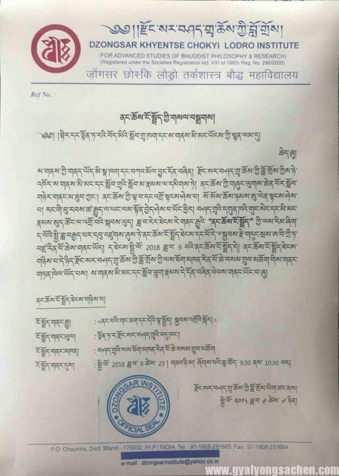 ནས་ནང་པའི་ལྟ་གྲུབ་དང་ནང་ཆོས་ཇི་ལྟར་ཉམས་ལེན་དགོས་ཚུལ་སོགས་ཀྱི་ནང་ཆོས་ངོ་སྤྲོད་སྤྱི་ཟླ་བརྒྱད་པའི་ནང་དུ་གནང་ཡོད་པ་མ་ཟད། ད་རན་ཐེངས་གཉིས་དེ་ཡང་སྤྱི་ཟླ་དགུ་པའི་ནང་དུ་རྫོང་གསར་བཤད་གྲྭའི་སློབ་སྤྱི་མཁན་རིན་པོ་ཆེ་བསམ་འགྲུབ་མཆོག་ནས་ནང་ཆོས་ངོ་སྤྲོད་ཀྱི་གསལ་བསྒྲགས་སྔོན་སོང་བཞིན་རེད་འདུག