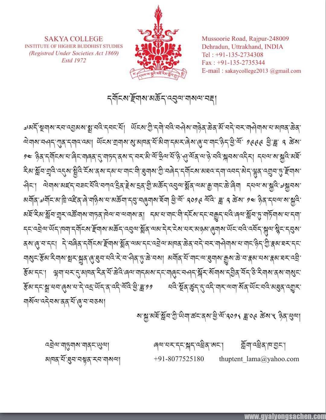 ས་སྐྱ་མཐོ་སློབ་ཀྱི་ཡིག་ཚང་ནས་ཕྱི་ལོ་༢༠༡༨ ཟླ་༠༩ ཚེས་༥ ཉིན་ཕུལ།
