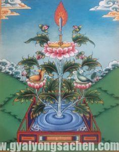 ན་མོ་མཉྫུགྷོ་ཥ་བྷཱུ་མིཔཎྜ་ར་པཎྜི་ཏཱ་ཡ། །བདག་ཉིད་ཆེན་པོ་ས་སྐྱ་པཎྜི་ཏས་བསམ་ཡས་སུ་ཆོས་ཀྱི་འཁོར་ལོ་བསྐོར་བའི་སྐབས་ཤིག་ཏུ་སྔོན་བྱོན་དམ་པ་རྣམས་ཀྱི་རྣམ་ཐར་དང་སྐུ་དྲིན་རྗེས་སུ་དྲན་པའི་རྐྱེན་གྱིས་ད་ལྟ་རང་རེས་འདྲི་སྲོལ་ཡོད་པའི་རི་མོ་འདི་དག་ཕྱག་བསྟར་དུ་གནང་བའི་ཞལ་བྱང་དུ། །སྡོམ་བརྩོན་དམ་པ་དཔལ་ལྡན་ཞི་བ་འཚོ་ཞེས་སོགས་ཀྱི་ཚིགས་སུ་བཅད་པ་རྣམས་འགོད་པར་མཛད་དོ། །དེ་དག་གི་མཚོན་དོན་ཙམ་བཤད་ན་དབུས་ཀྱི་པདྨའི་སྡོང་པོས་ནི་སློབ་དཔོན་ཆེན་པོ་པདྨ་འབྱུང་གནས་མཚོན་ཏེ་སློབ་དཔོན་གྱི་མཚན་དང་ཆོས་མཚུངས། །པདྨའི་ལྟེ་བའི་རལ་གྲིས་ནི་འཇམ་དབྱངས་ཀྱི་སྤྲུལ་པ་ཆོས་རྒྱལ་ཁྲི་སྲོང་ལྡེའུ་བཙན་མཚོན་ཏེ་སྤྲུལ་གཞིའི་མཚན་མ་ཉིད་དོ། །དེ་གཉིས་ཡོན་མཆོད་རྣམ་པ་ཐ་དད་ཀྱང་ཡེ་ཤེས་གཅིག་པའི་ཕྱིར་རྟེན་དང་བརྟེན་པའི་ཚུལ་ལམ། །སློབ་དཔོན་ཆེན་པོའི་ཐུགས་ལས་སྐྱེས་པའི་ཆོས་སྲས་རྗེ་འབངས་ཉེར་ལྔར་གྲགས་པའི་གཙོ་བོ་ནི་མི་རྗེ་ཁྲི་སྲོང་ལྡེའུ་བཙན་ཡིན་པས་པདྨའི་ཟེའུ་འབྲུ་ལས་འཐོན་པའི་ཚུལ་དུ་བཀོད་པའོ། །པད་སྡོང་གི་གཡས་ཕྱོགས་ཀྱི་ངང་སེར་མགོ་གཉིས་པས་ནི་སློབ་དཔོན་ཆེན་པོ་ཞིབ་འཚོ་དང་ཀ་མ་ལ་ཤཱི་ལ་སྟེ་པདྨའི་ངང་ཚུལ་གཉིས་མཚོན་ཏེ་ཐུགས་ཀྱི་ལྟ་གྲུབ་དགོངས་པ་གཅིག་པས་ལུས་གཅིག་ལ། །གསུང་གིས་ཆོས་སོ་སོར་སྟོན་པས་མགྲིན་པ་གཉིས་ཅན། །སློབ་དཔོན་གཉིས་ཀའང་རྟེན་སྡོམ་བརྩོན་གྱི་མཆོག་ཏུ་བཞུགས་པས་ངང་སེར་གྱི་གཟུགས་སུ་བཀོད་པའོ། །གཡོན་ཕྱོགས་ཀྱི་ནེ་ཙོ་མགོ་གཉིས་པས་ནི་སྤྲུལ་པའི་ལོ་ཙཱ་བ་སྐ་པ་དཔལ་བརྩེགས་དང་ཅོག་རོ་ཀླུའི་རྒྱལ་མཚན་གཉིས་མཚོན་ཏེ་ཐུགས་དགོངས་གཅིག་ལ་ཆོས་སོ་སོར་སྟོན་པས་ལུས་གཅིག་མགྲིན་པ་གཉིས་ཅན། །ནེ་ཙོས་བྱ་སྐད་དང་མི་སྐད་གཉིས་སྨྲ་བ་ལྟར་ལོ་ཙཱ་བས་ཀྱང་རྒྱ་བོད་ཀྱི་སྐད་གཉིས་སྨྲ་བས་ནེ་ཙོའི་གཟུགས་སུ་བཀོད་པའོ། །དེ་ཐམས་ཅད་ཀྱང་རྒྱ་མཚོ་ཆེན་པོའི་དབུས་སུ་གནས་པ་ནི་དཔལ་བསམ་ཡས་མི་འགྱུར་ལྷུན་གྱིས་གྲུབ་པའི་གཙུག་ལག་ཁང་འདི་ཉིད་ལ་དུས་དབང་གིས་མེའི་གནོད་པ་འབྱུང་བ་ལུང་བསྟན་པ་ཞི་བའི་རྟེན་འབྲེལ་ཡིན་ཏེ་ཞལ་བྱང་གི་གཤམ་དུ་གཙུག་ལག་ཁང་འདི་ལ་ཕན་པའི་རྟེན་འབྲེལ་ཞིག་ཡོད་ཅེས་གསུག་པས་ཤེས་སོ། །དེ་དག་གི་དགོས་པ་ནི། །བོད་རྨོངས་པའི་གླིང་དུ་སངས་རྒྱས་ཀྱི་བསྟན་པའི་ཉི་མ་ཤར་བ་ནི་མཁན་སློབ་ཆོས་གསུམ་ལོ་ཙཱ་བ་དང་བཅས་པའི་ཐུགས་བསྐྱེད་དང་སྨོན་ལམ་བདག་པོའི་རྐྱེན་དང་ཕྲིན་ལས་ཀྱི་ཕྱག་རྗེས་ཁོ་ན་ཡིན་ནོ་ཞེས་དྲན་བསྐུལ་དད་པའི་གསལ་འདེབས་དང་། །བྱས་པ་ཤེས་ཤིང་དྲིན་དུ་བཟོ་བ་ནི་སྐྱེས་བུ་དམ་པའི་རྣམ་ཐར་ཡིན་པས་ན་སྐྱེ་བོ་བློ་གྲོས་དང་ལྡན་པ་དག་གིས་གཙོ་བོར་བསྟན་པའི་བྱ་བ་འཆད་ཉན་སྒོམ་ས