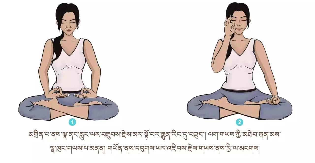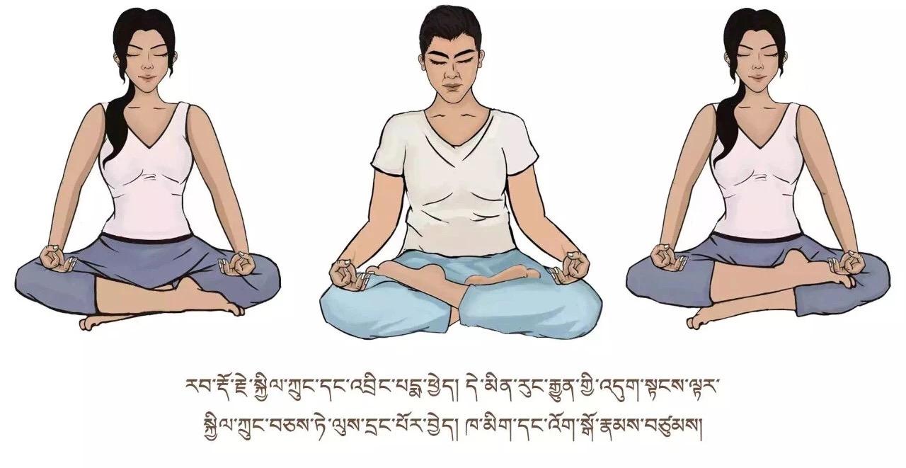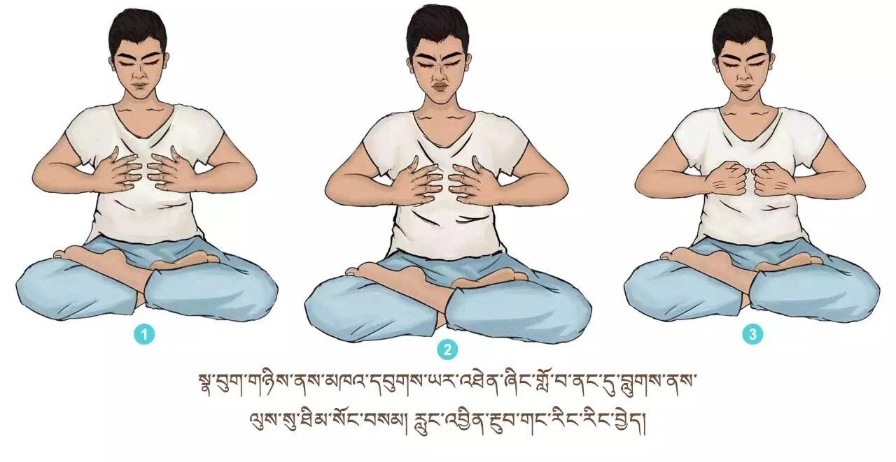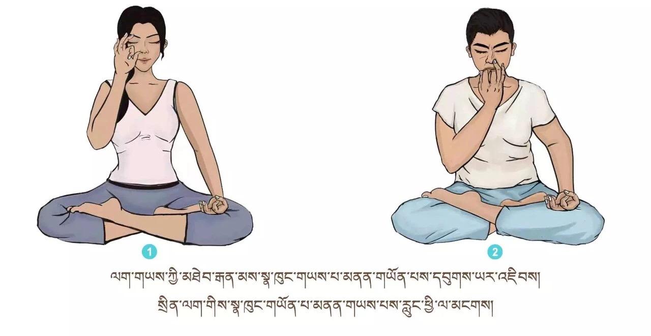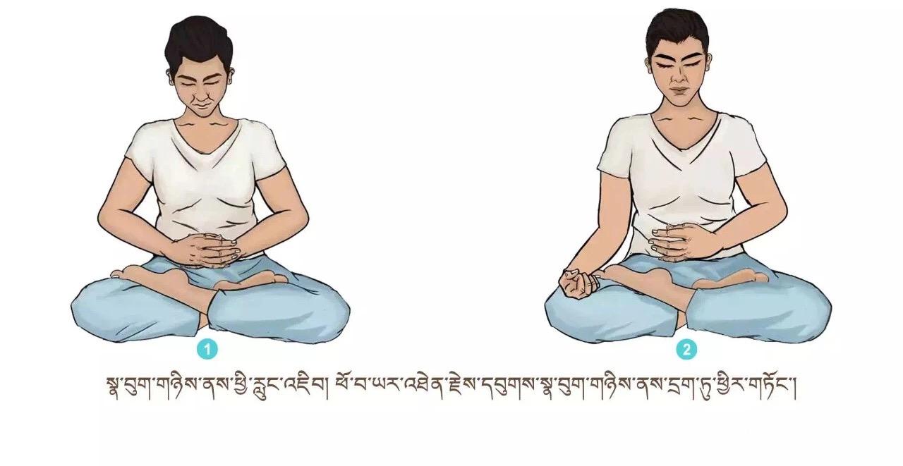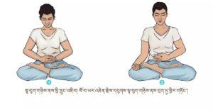 ལུས་དྲང་པོ་བྱས་ཏེ་འདུག་ལ། གཡས་གཡོན་གྱི་མཐེབ་མཛུབ་ཀྱི་རྩེ་གཏུགས་ཏེ་ཨ་ལོང་ལྟར་བྱས། སོར་མོ་གཞན་རྣམས་རྐྱང་བཞིན་པུས་མོ་གཡས་གཡོན་སྟེང་དུ་གན་རྐྱལ་དུ་འཇོག ཁ་མིག་བཙུམས་ཏེ་སྣ་བུག་གཉིས་ནས་མཁའ་དབུགས་དྭངས་གཙང་རྣམས་ཡར་མ་རྫོགས་པར་འཐེན་ཞིང་གློ་བའི་ནང་དུ་བླུགས་ནས་ལུས་སུ་ཐིམ་སོང་བསམ་ལ། ཡང་གློ་བའི་ནང་གི་ནད་འབུ་མི་གཙང་བ་ཡོད་དོ་ཅོག་སྣ་བུག་གཉིས་ནས་མར་ན་ར་ར་ཐོན་སོང་བའི་མོས་པར་བྱ། རླུང་འབྱིན་རྔུབ་གང་རིང་རིང་བྱེད་དགོས། དུས་ཡུན་རེས་མོས་སྐར་མ་གཉིས་ནས་ལྔ་བར། ཁྲག་ཤེད་མཐོ་བ་དང་སྙིང་ནད་ཅན་རྣམས་ཀྱིས་དལ་མོ་ལས་ཤུགས་ཆེན་བྱ་མི་རུང་།