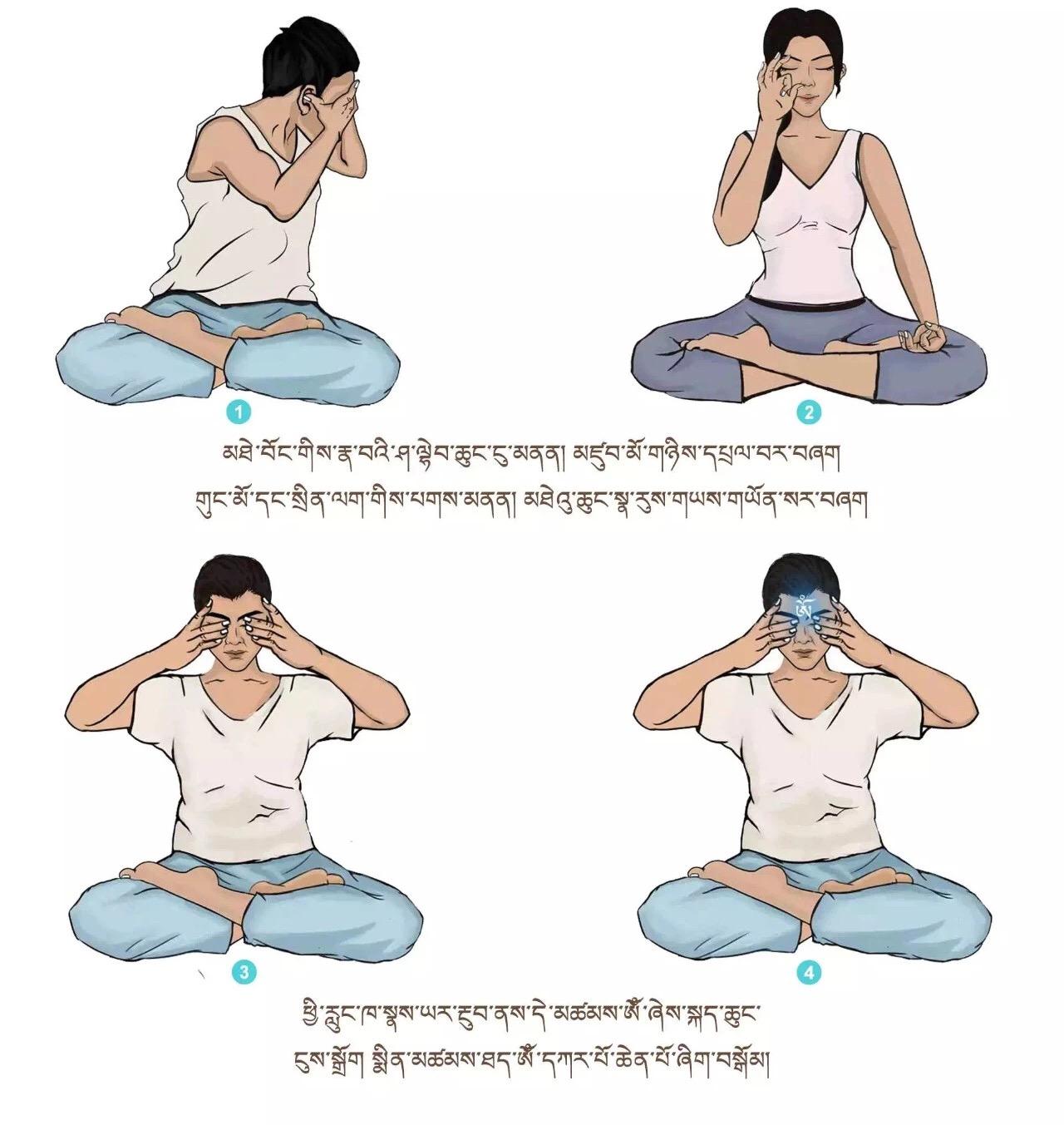 ལག་གཡས་གཡོན་གྱི་མཐེ་བོང་གཉིས་ཀྱིས་རྣ་བའི་ཤ་ལྷེབ་ཆུང་ངུ་མནན་ཏེ་རྣ་ཁུང་གཉིས་བཀག མཛུབ་མོ་གཉིས་དཔྲལ་བར་བཞག གུང་མོ་དང་སྲིན་ལག་གཉིས་ཀྱིས་པགས་མནན། མཐེའུ་ཆུང་གཉིས་སྣ་རུས་གཡས་གཡོན་སར་བཞག་སྟེ། ཕྱི་རླུང་ཁ་སྣ་གཉིས་ཀྱིས་ཡར་རྔུབ་ནས་དེ་མཚམས་ཨོྃ་ཞེས་འབུ་སྦྲང་མའི་སྐད་བཞིན་སྒྲ་མི་གསལ་བའི་ཚུལ་དུ་ཟེར་མ་ནུས་བར་སྐད་ཆུང་ངུས་སྒྲོག སྨིན་མཚམས་ཐད་ཨོྃ་དཀར་པོ་ཆེན་པོ་ཞིག་བསྒོམ་ལ་སངས་རྒྱས་དང་རྩ་བའི་བླ་མའི་སྐུ་གསུང་ཐུགས་འདུས་པའི་བདག་ཉིད་དུ་མོས་བཞིན་བརྩོན་པར་བྱའོ། །